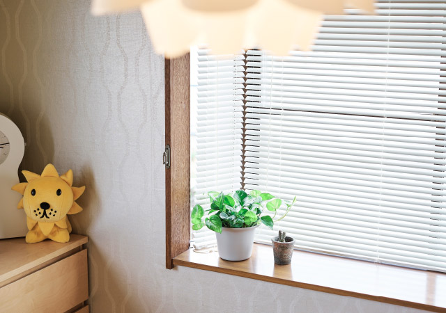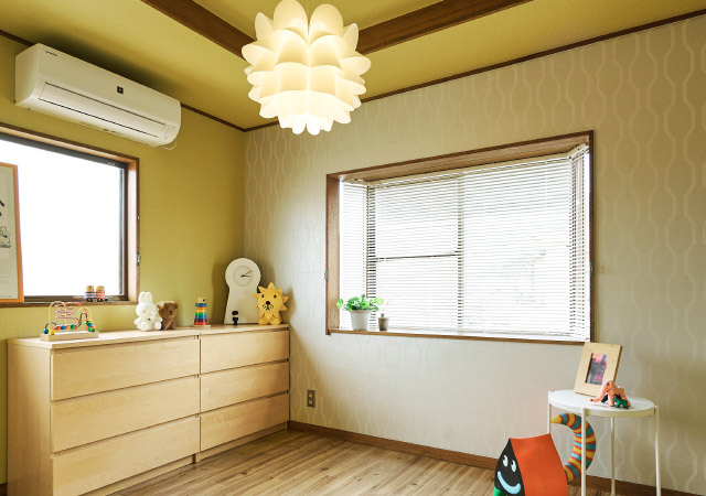 素材・・・天井:サンゲツFE-6032 /壁紙:メインサンゲツFE-6032アクセントサンゲツSGA-2425 床:サンゲツHM-10047 / 出窓ブラインド:タチカワ 床面積・・・ 9㎡